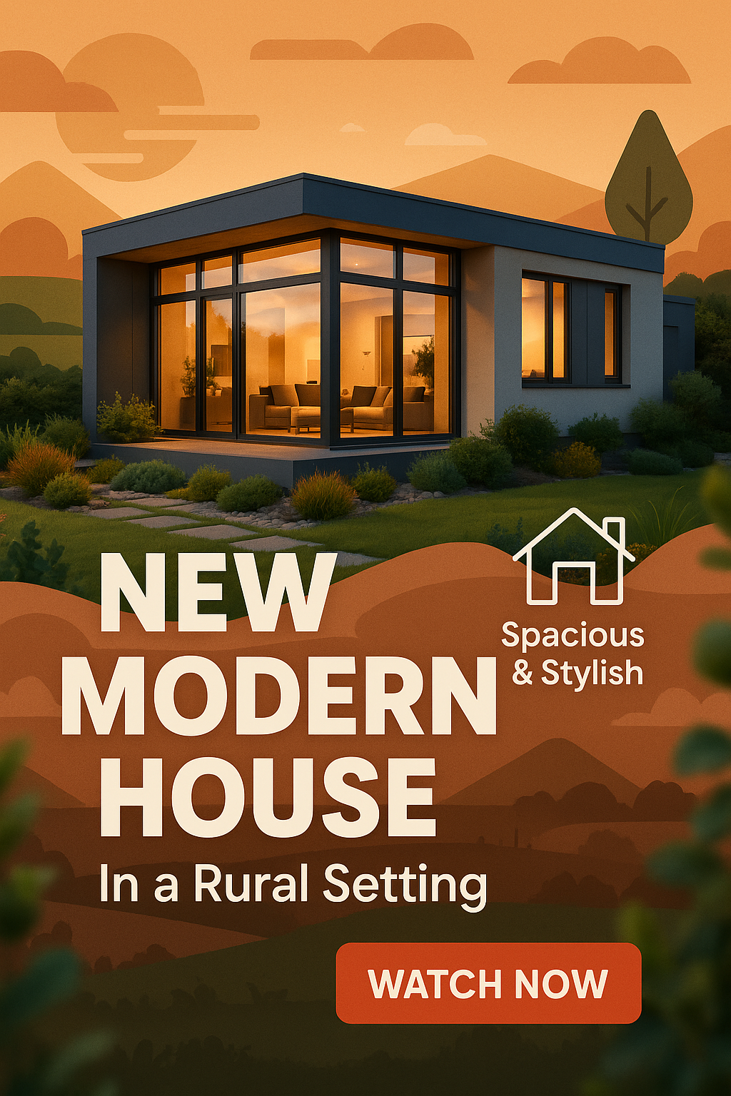 Promotional graphic showcasing a modern house in a rural setting, featuring a warm color palette and inviting design elements. Ideal for real estate marketing.