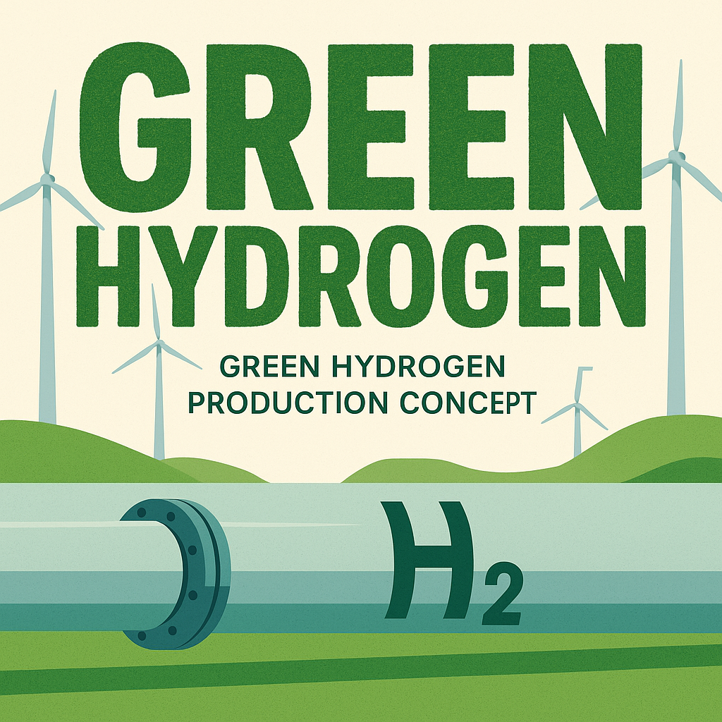 /Collection: /by davooda/Type: PNG/A visually engaging graphic representing the concept of green hydrogen production. The design features a pipeline and wind turbines, aimed at promoting sustainable energy solutions.