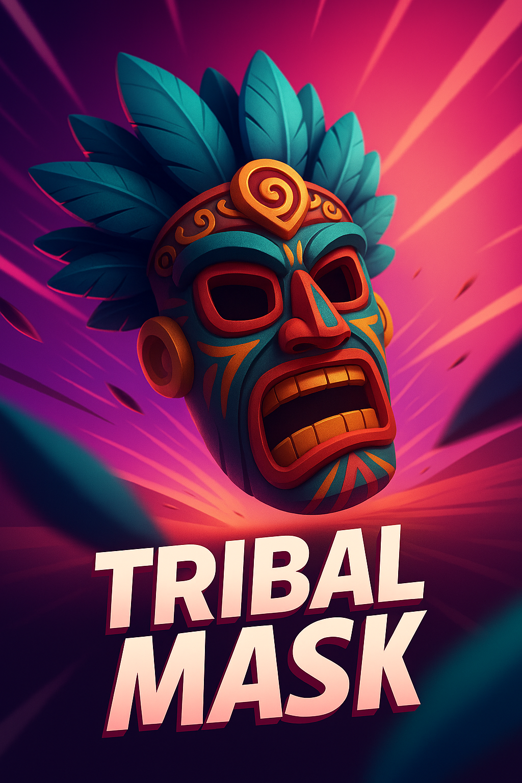 A vibrant 3D illustration of a tribal mask, featuring intricate designs and dynamic lines radiating outward. The background transitions smoothly, enhancing the mask's striking colors.