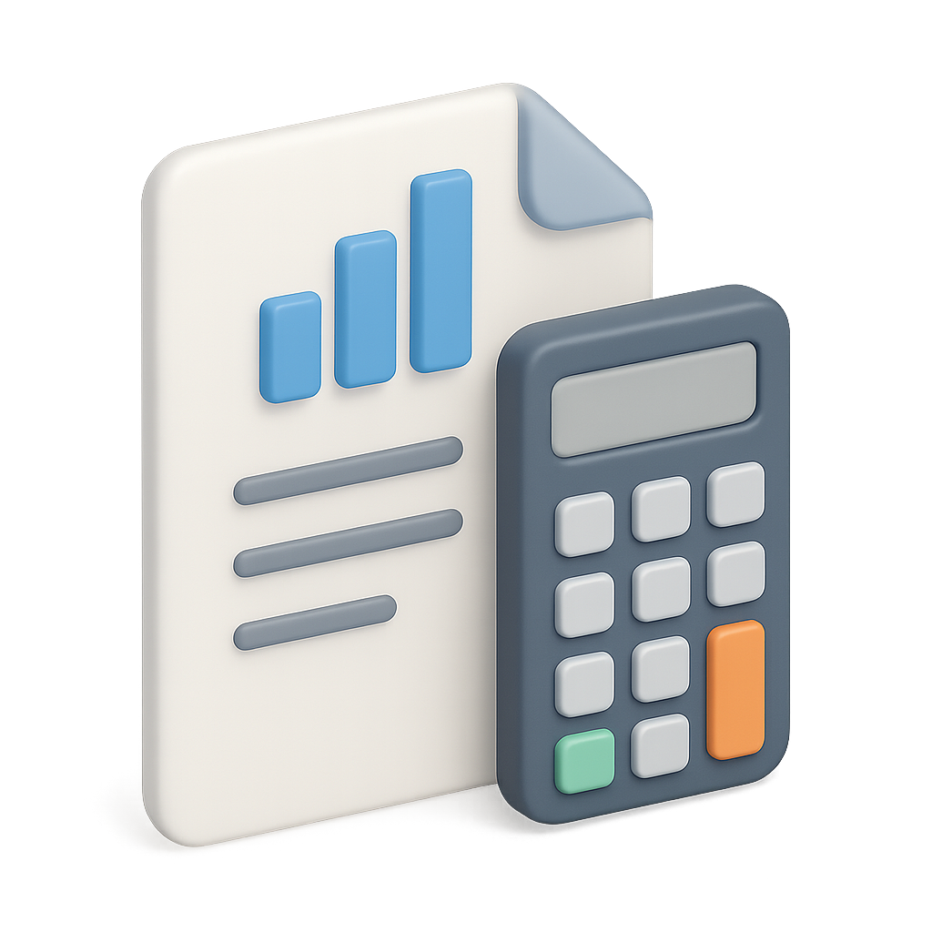 A visually appealing 3D icon featuring a financial report with bar graphs and a calculator. The design is isometric and volumetric, providing a modern feel.