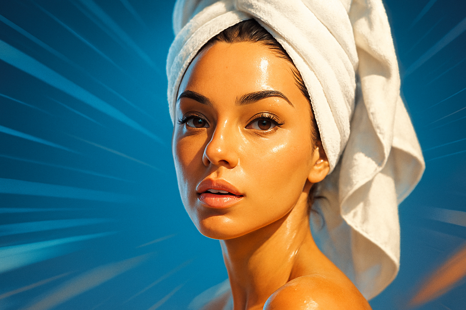 An attractive woman with a towel wrapped around her head, exuding a sense of dynamic beauty. The background features a smooth gradient with rays emanating from the center, enhancing the lively atmosphere.