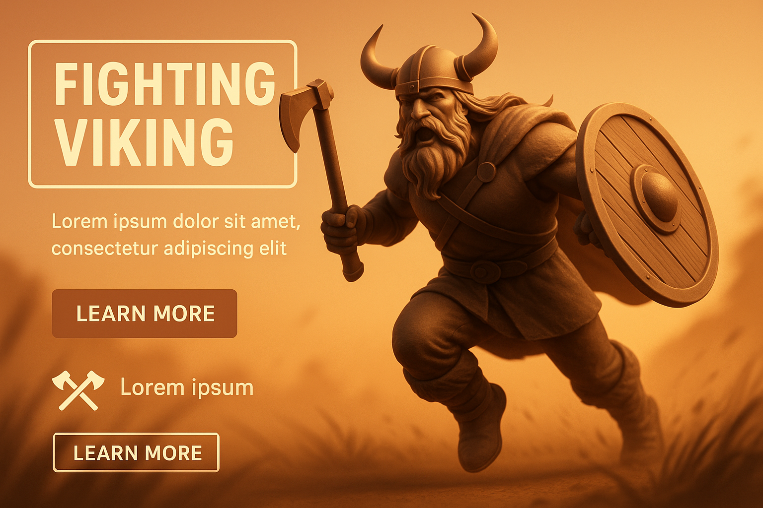 /Collection: /by davooda/Type: PNG/3D rendered illustration of a Viking warrior in action, perfect for gaming or fantasy themes. The warm color palette and bold typography enhance its promotional appeal.