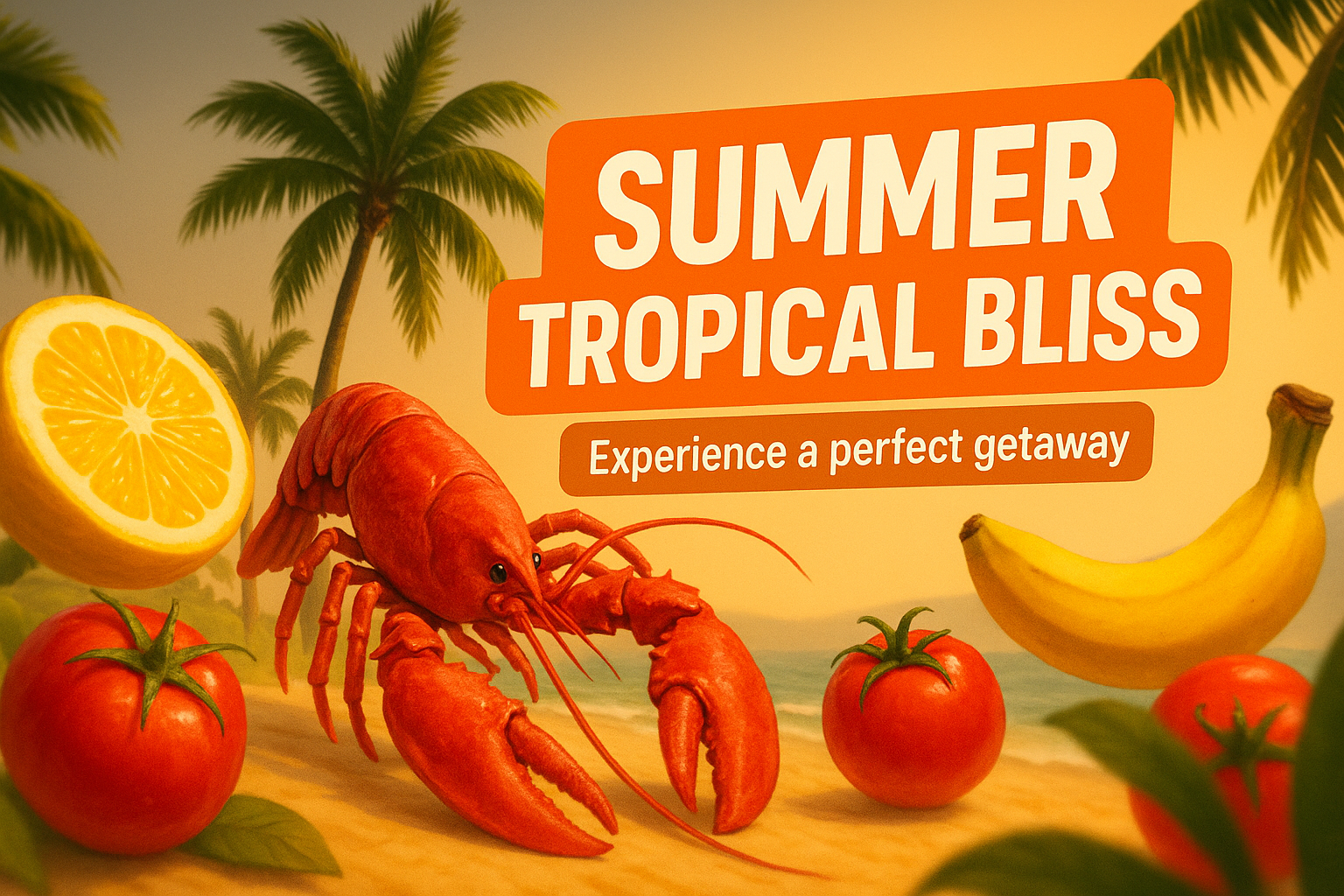 Colorful digital illustration showcasing a tropical theme with fruits and a lobster, ideal for summer getaway promotions or travel marketing.