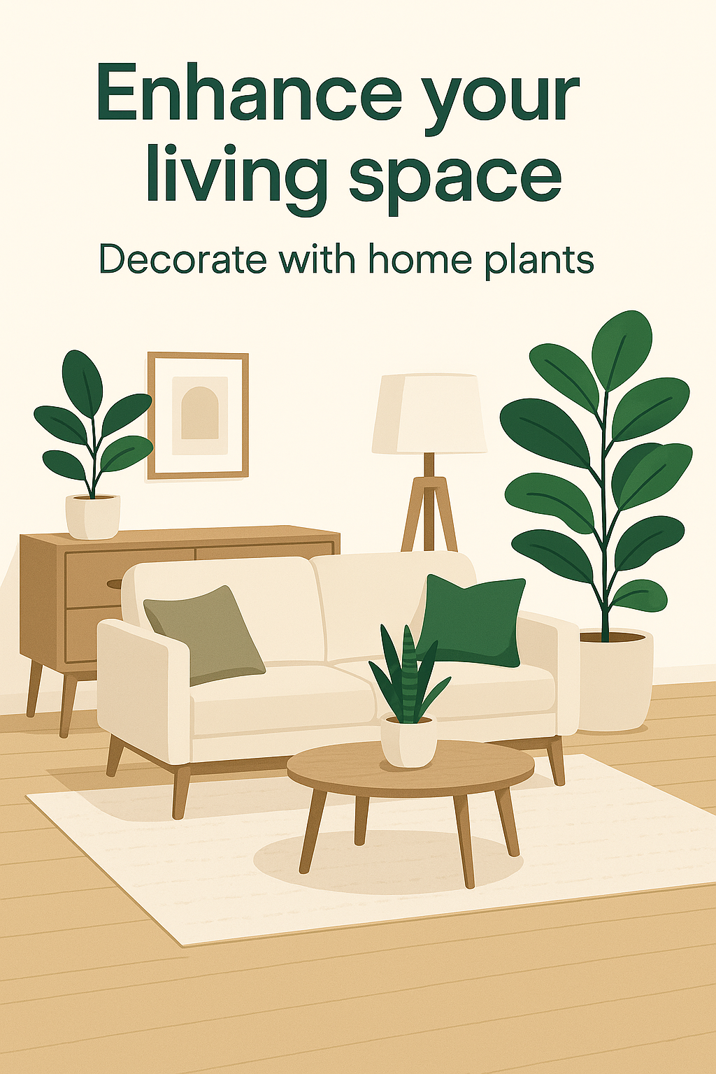 Stylized graphic depicting a cozy living room setting adorned with houseplants, ideal for home decor inspiration and design ideas.