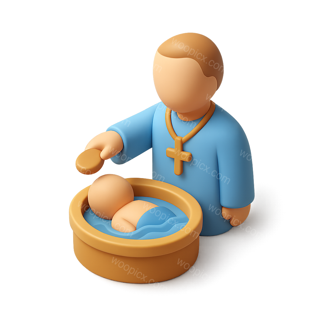 /Premium/Collection: /by davooda/Type: PNG/A stylized 3D icon depicting a baptism scene, featuring a figure in blue attire and a cross, gently leaning over a basin with a figure inside, all in an isometric perspective.
