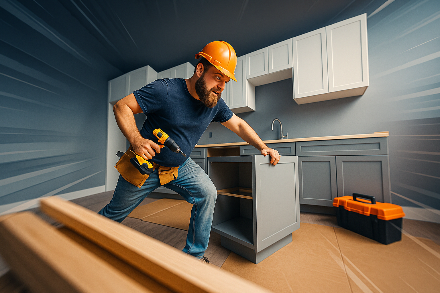 /Collection: /by davooda/Type: PNG/A skilled worker prepares a kitchen for custom installations, showcasing a vibrant and dynamic environment. The scene features modern cabinetry and tools, emphasizing an engaging, realistic aesthetic.