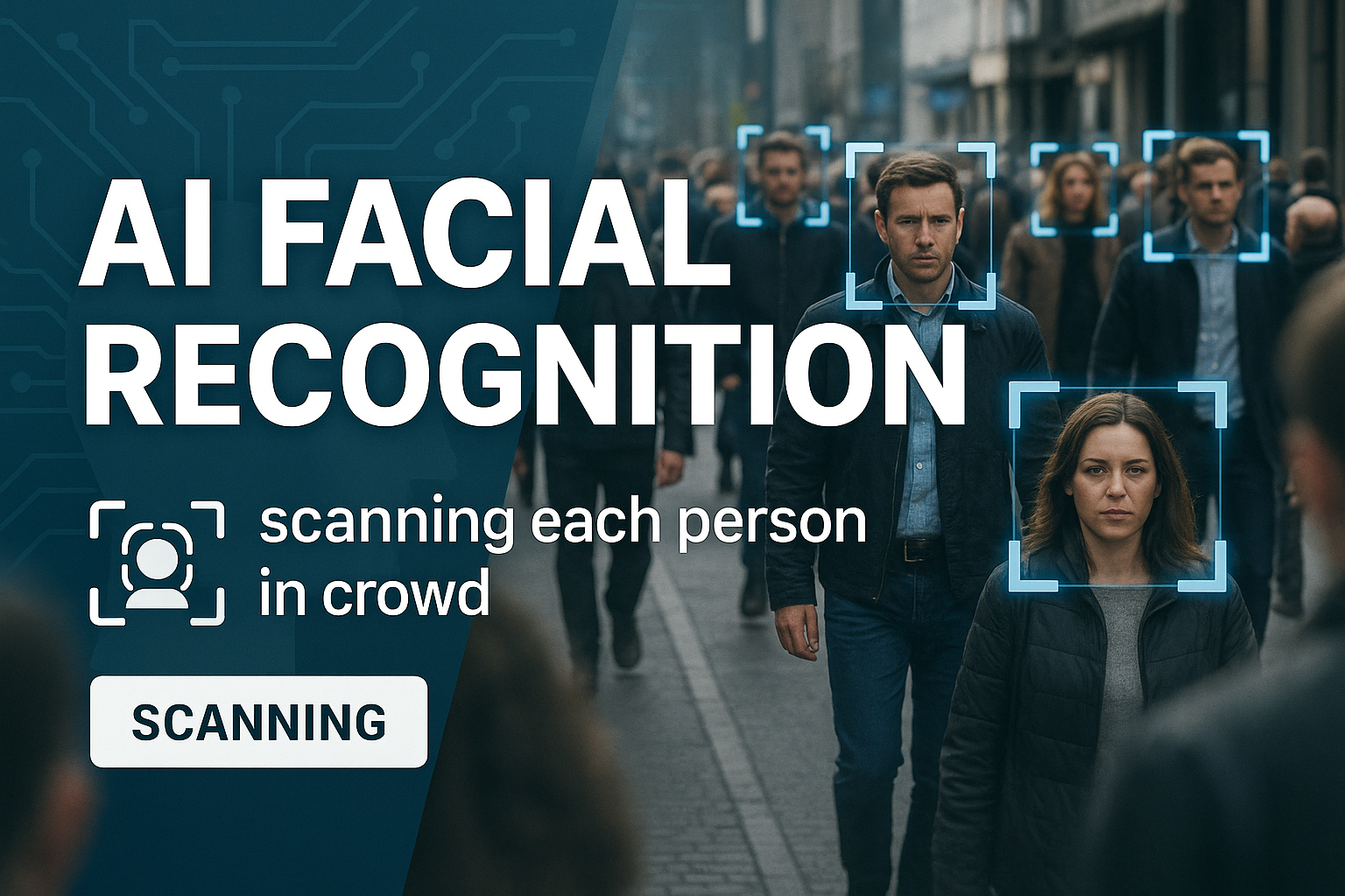 Dynamic social media post showcasing AI facial recognition technology in an urban crowd, emphasizing modern surveillance themes with a professional design.