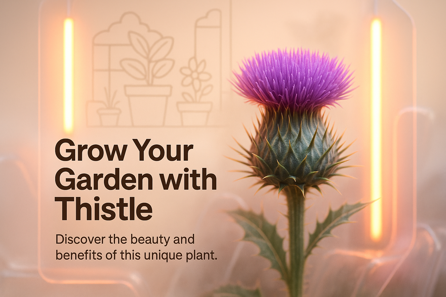 Engaging promotional graphic showcasing a thistle plant, designed to attract gardening enthusiasts. Features modern typography and soft background elements, ideal for social media or blog use.