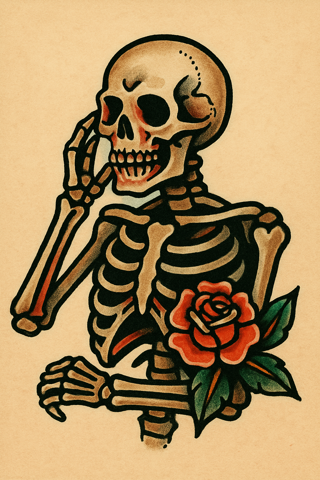 This image features a vintage-style illustration of a skeleton thoughtfully holding its head, adorned with a vibrant rose. Ideal for tattoo art or Halloween themes.