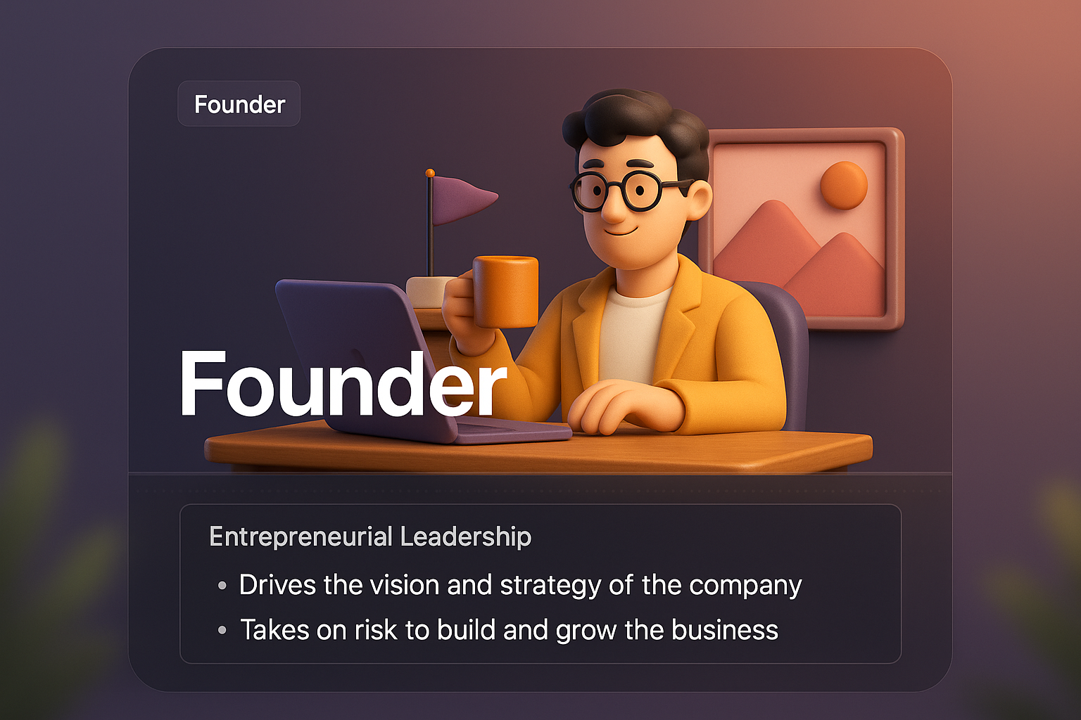 A vibrant 3D illustration of a founder character working at a desk, with a laptop and coffee. The design includes stylish text blocks highlighting entrepreneurial leadership, integrated seamlessly into the scene.