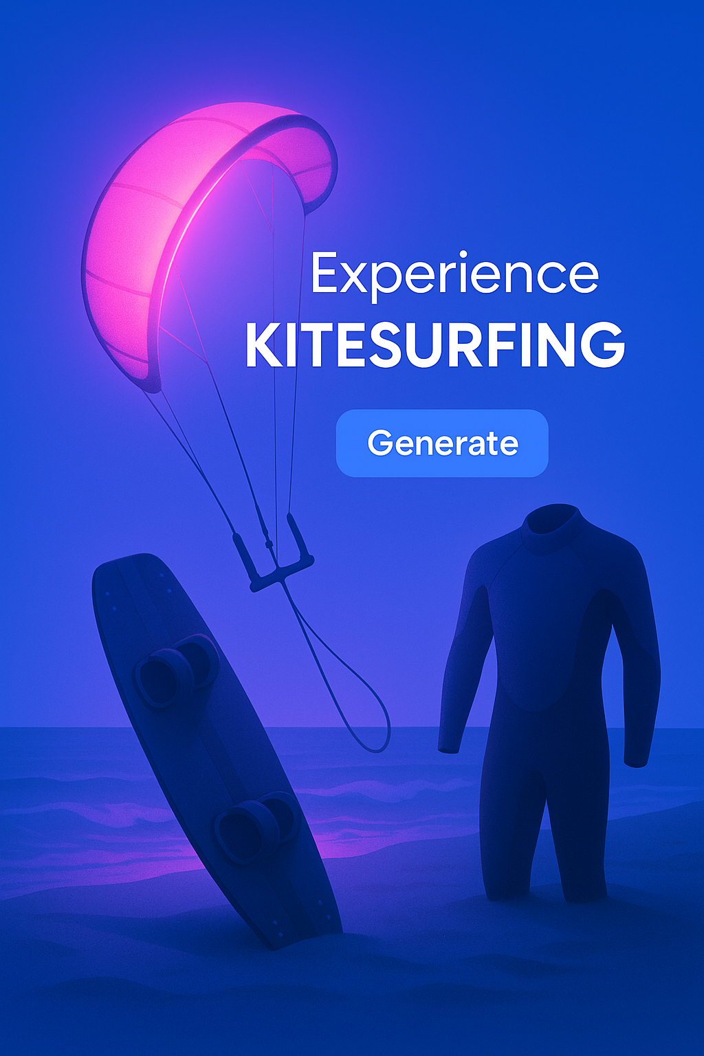 /Collection: /by davooda/Type: PNG/A vibrant kitesurfing scene featuring a glowing kite and board against a solid blue background. The neon-pink glow illuminates the composition, enhancing the atmosphere with cool shades.