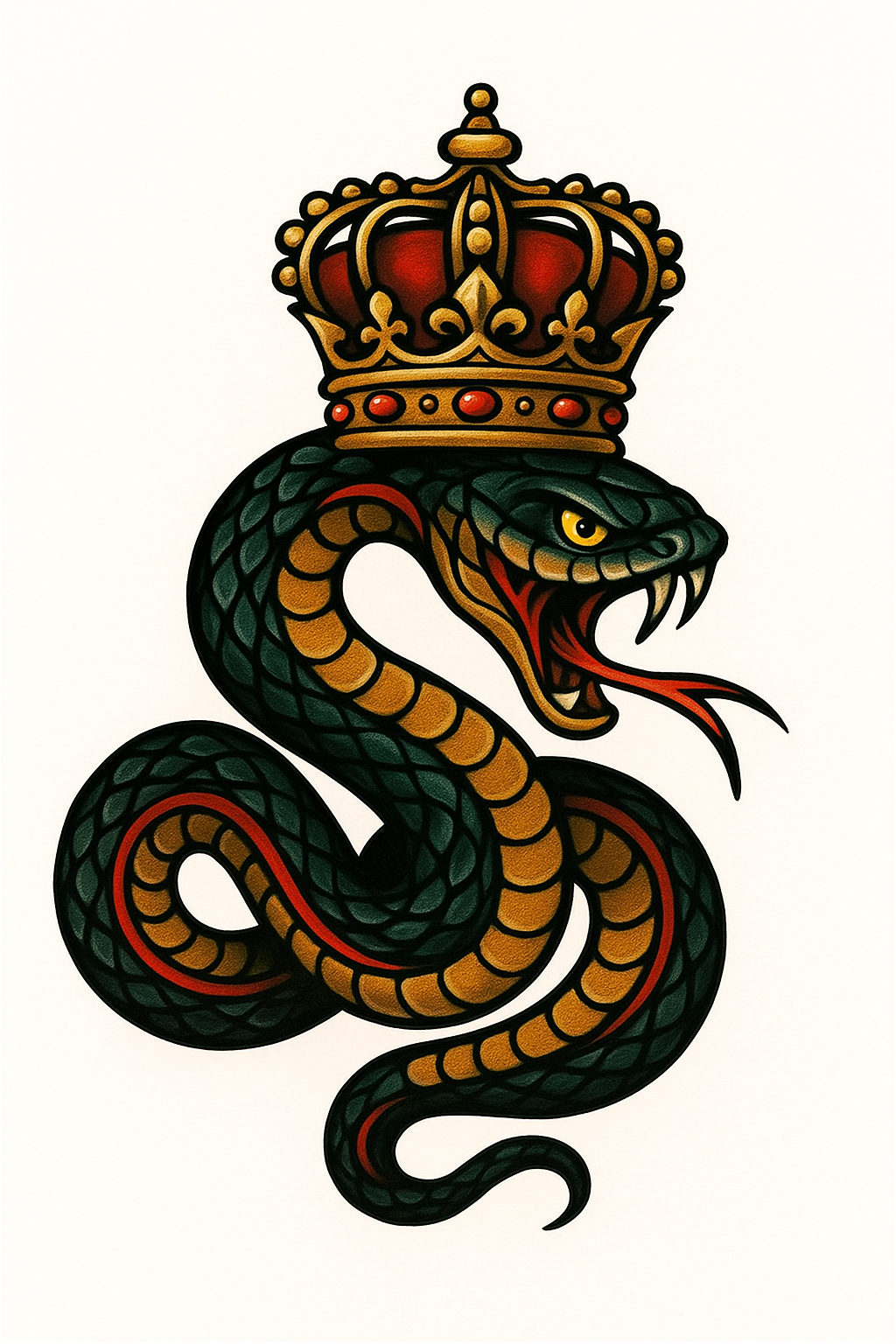 A striking graphic featuring a snake with a regal crown, showcasing bold colors and detailed line work. Ideal for tattoo designs or illustrative art.