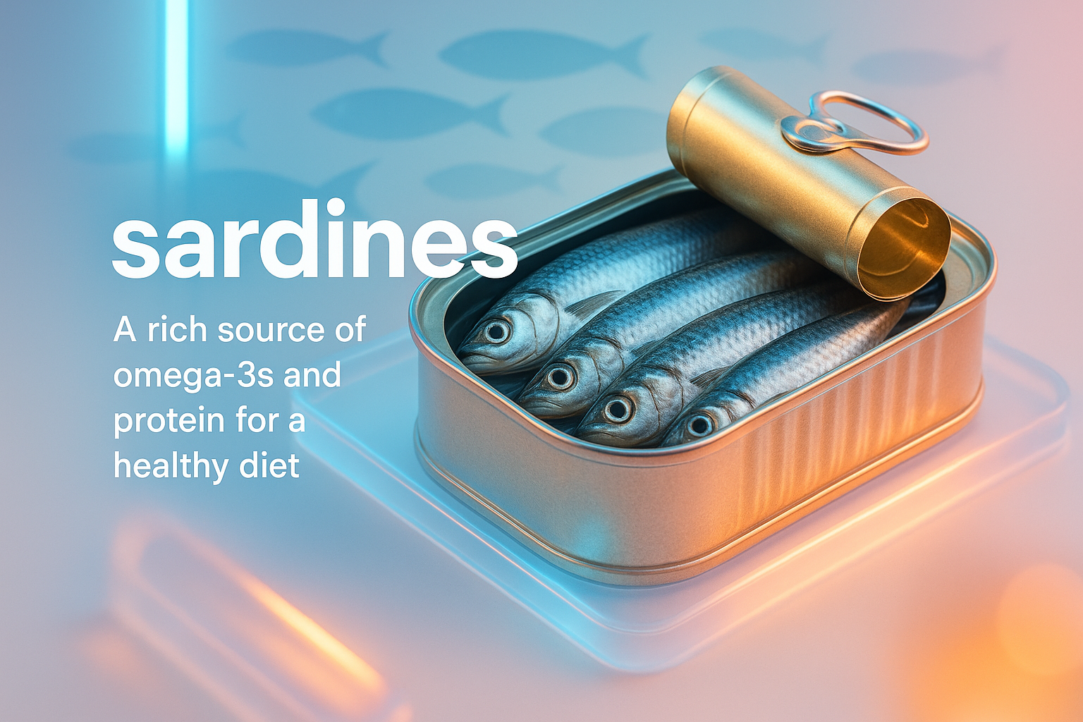 /Collection: /by davooda/Type: PNG/A visually appealing 3D render of sardines inside an open can, showcasing a modern design theme. Ideal for health and nutrition marketing, emphasizing omega-3 benefits.