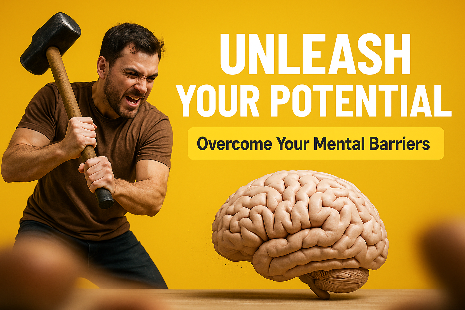 /Collection: /by davooda/Type: PNG/Dynamic motivational image showcasing a man with a hammer symbolically breaking mental barriers represented by a brain, ideal for self-improvement campaigns.