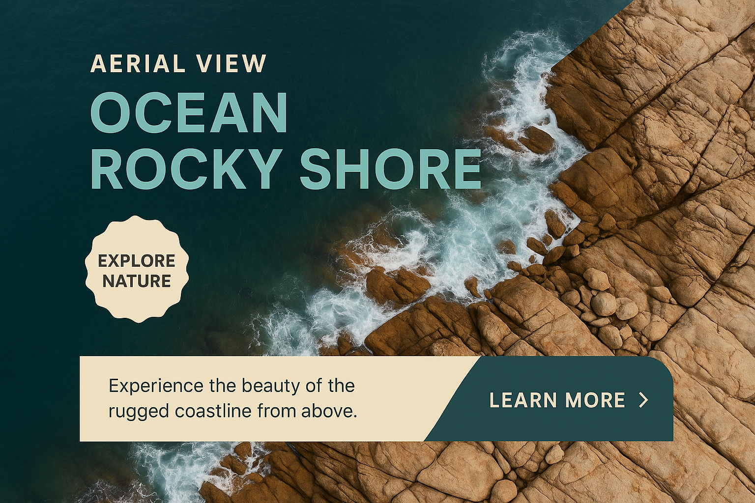 /Collection: /by davooda/Type: PNG/An aerial view showcasing a rocky ocean shore, featuring layered design elements like a call-to-action button and a contrasting subtitle. The image captures the rugged beauty of the coastline.