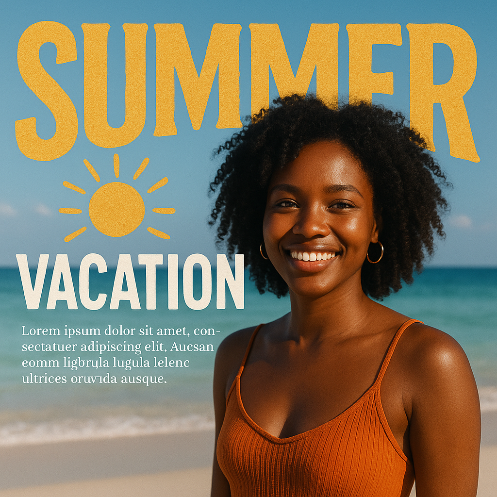 Bright Summer Vacation Promotion with Smiling Woman on Beach