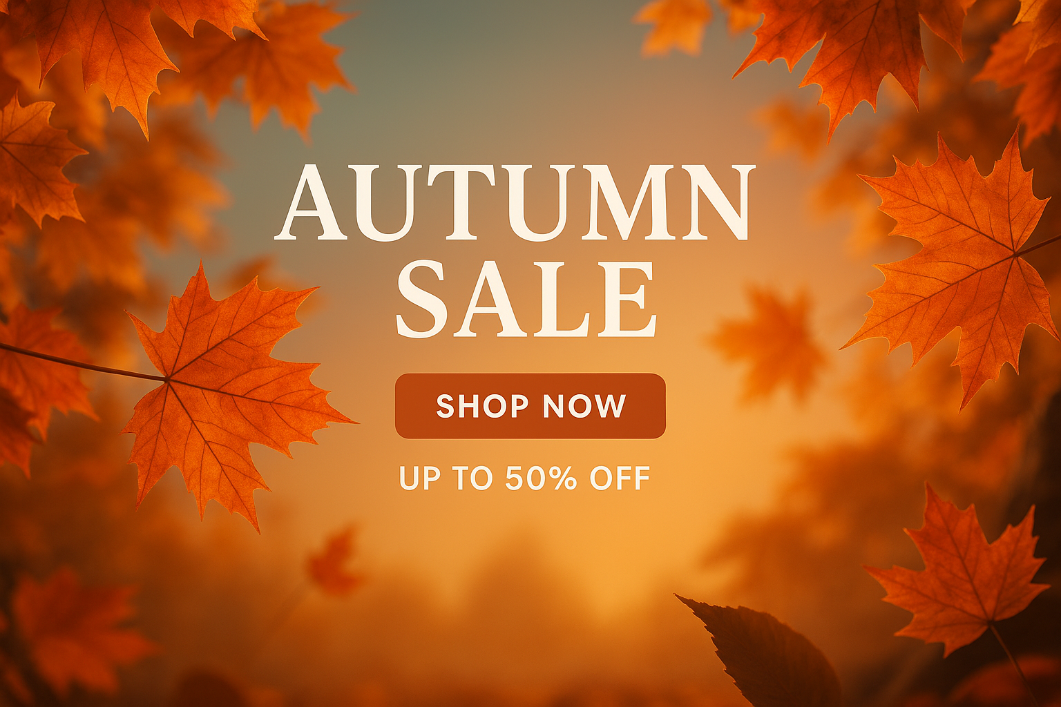 This is a promotional banner featuring autumn leaves, designed to advertise a sale. The warm color palette and inviting text create a seasonal appeal for shoppers.