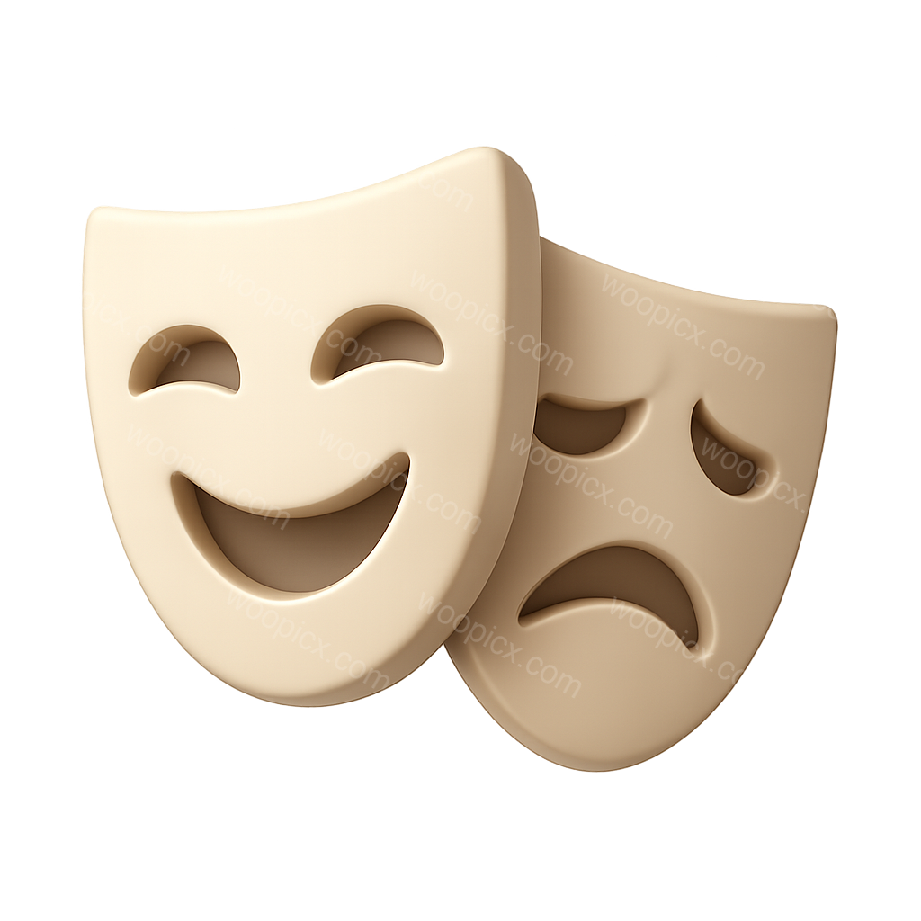 /Premium/Collection: /by davooda/Type: PNG/This image features two stylized 3D theater masks, one expressing joy and the other sorrow, set against a softly illuminated background. The masks are designed with a smooth, volumetric appearance.