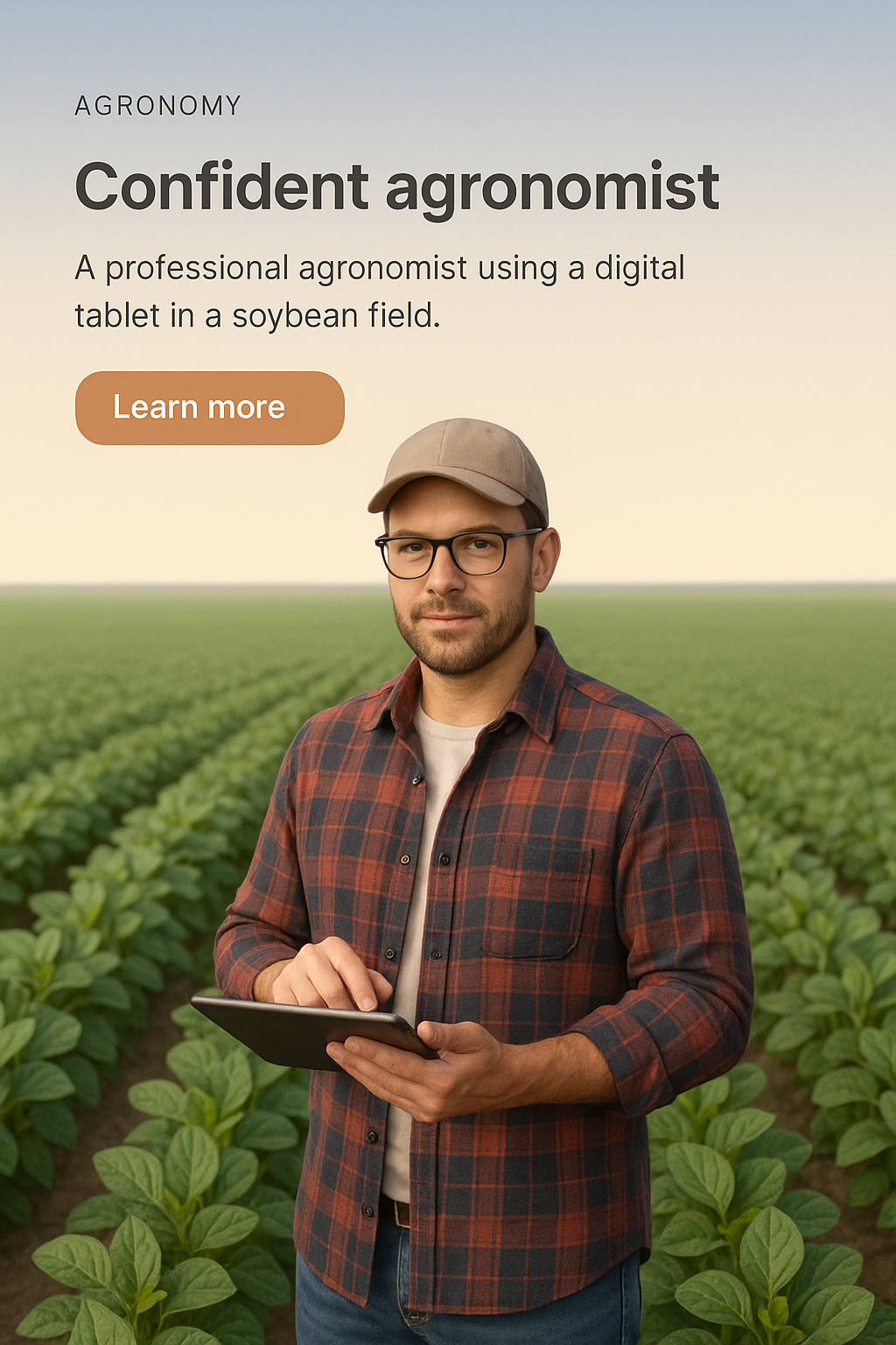 Confident Agronomist in Soybean Field with Digital Tablet