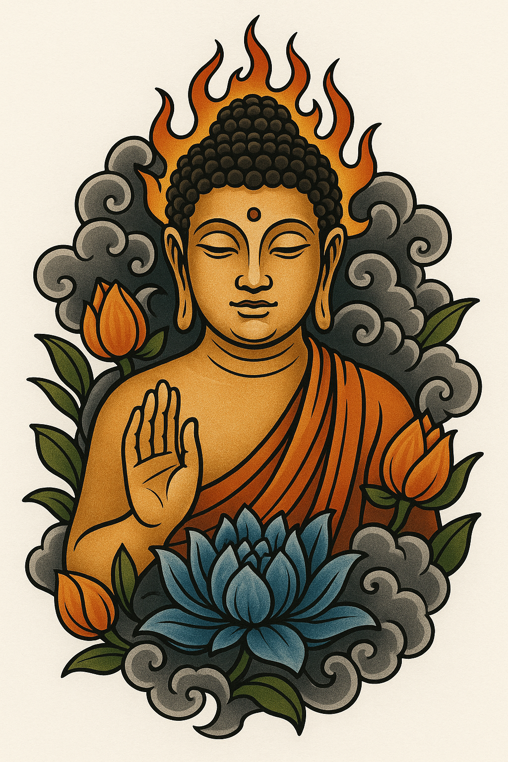 Illustration of Buddha Surrounded by Flames and Lotus Flowers
