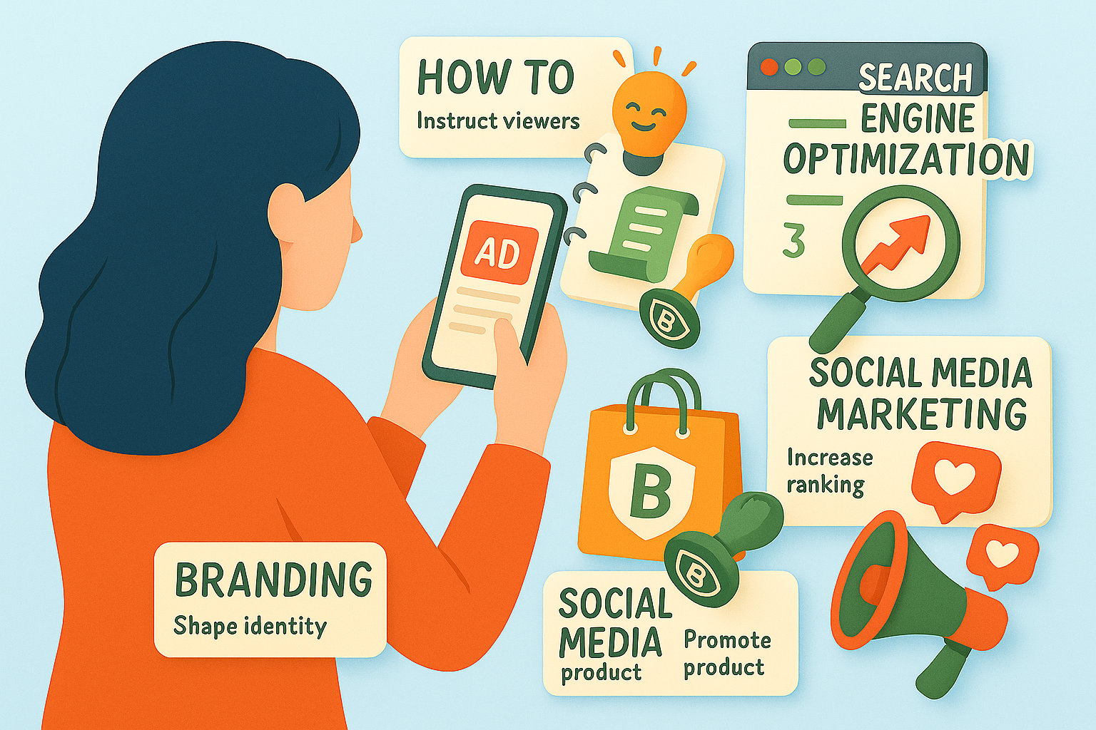 Colorful infographic illustrating various digital marketing strategies, including SEO and social media marketing, designed for educational purposes.