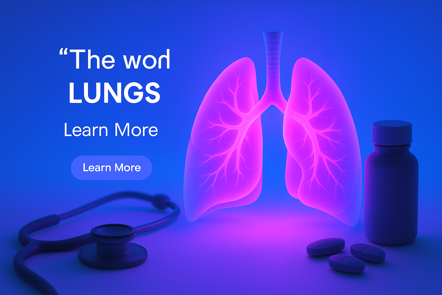 /Collection: /by davooda/Type: PNG/The image features a glowing representation of lungs in neon pink, surrounded by medical objects like a stethoscope and pill bottle, set against a solid blue background.