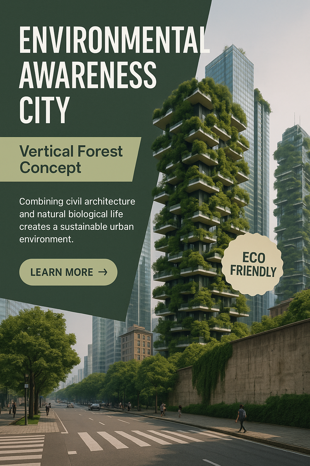A stunning digital art representation of a city integrating vertical forests, showcasing a blend of civil architecture and greenery. The design emphasizes sustainability and urban life.