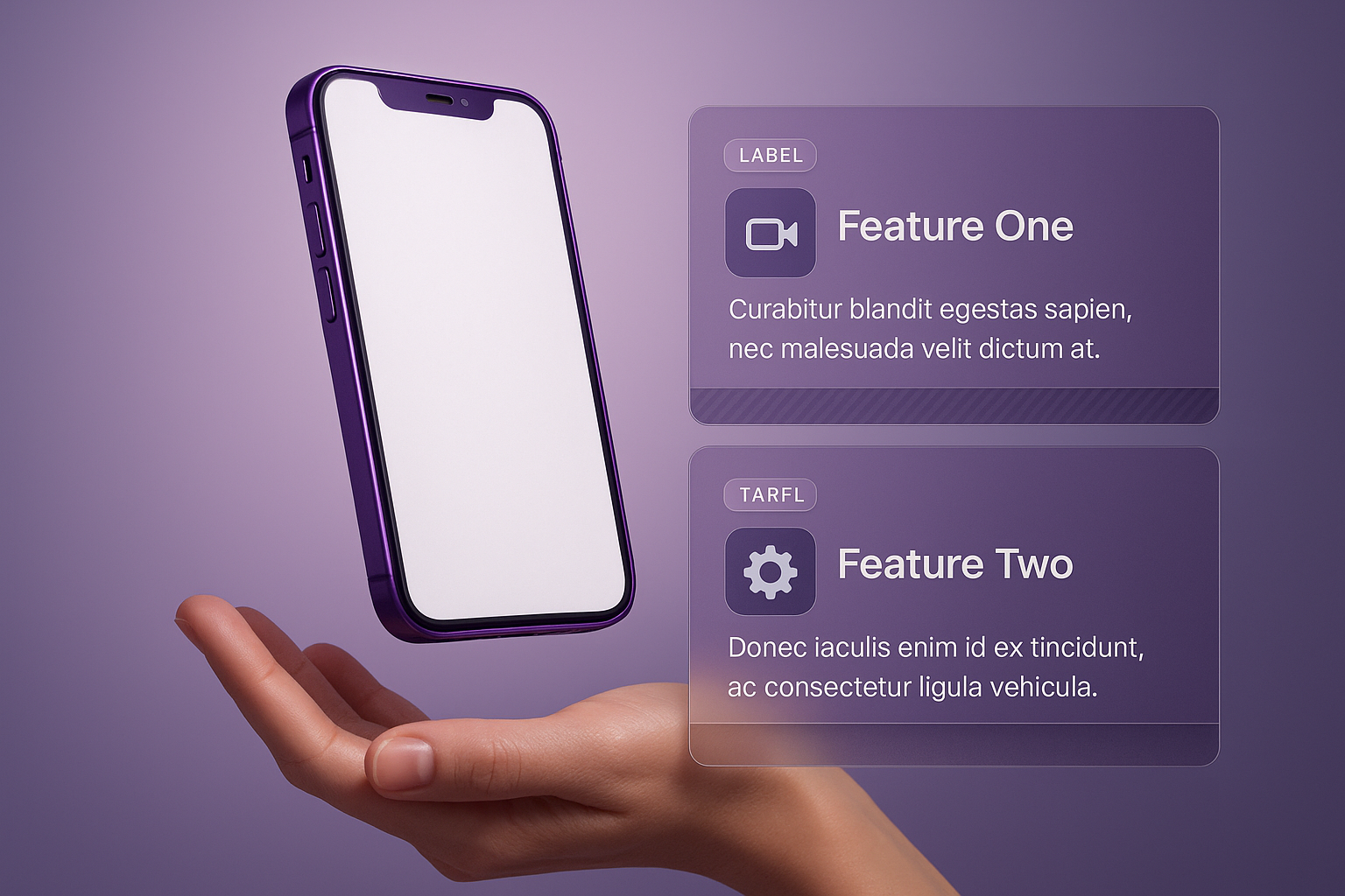 A sleek purple phone hovers above a hand against a soft gradient background. Two stylish info blocks integrate seamlessly, enhancing the modern aesthetic.