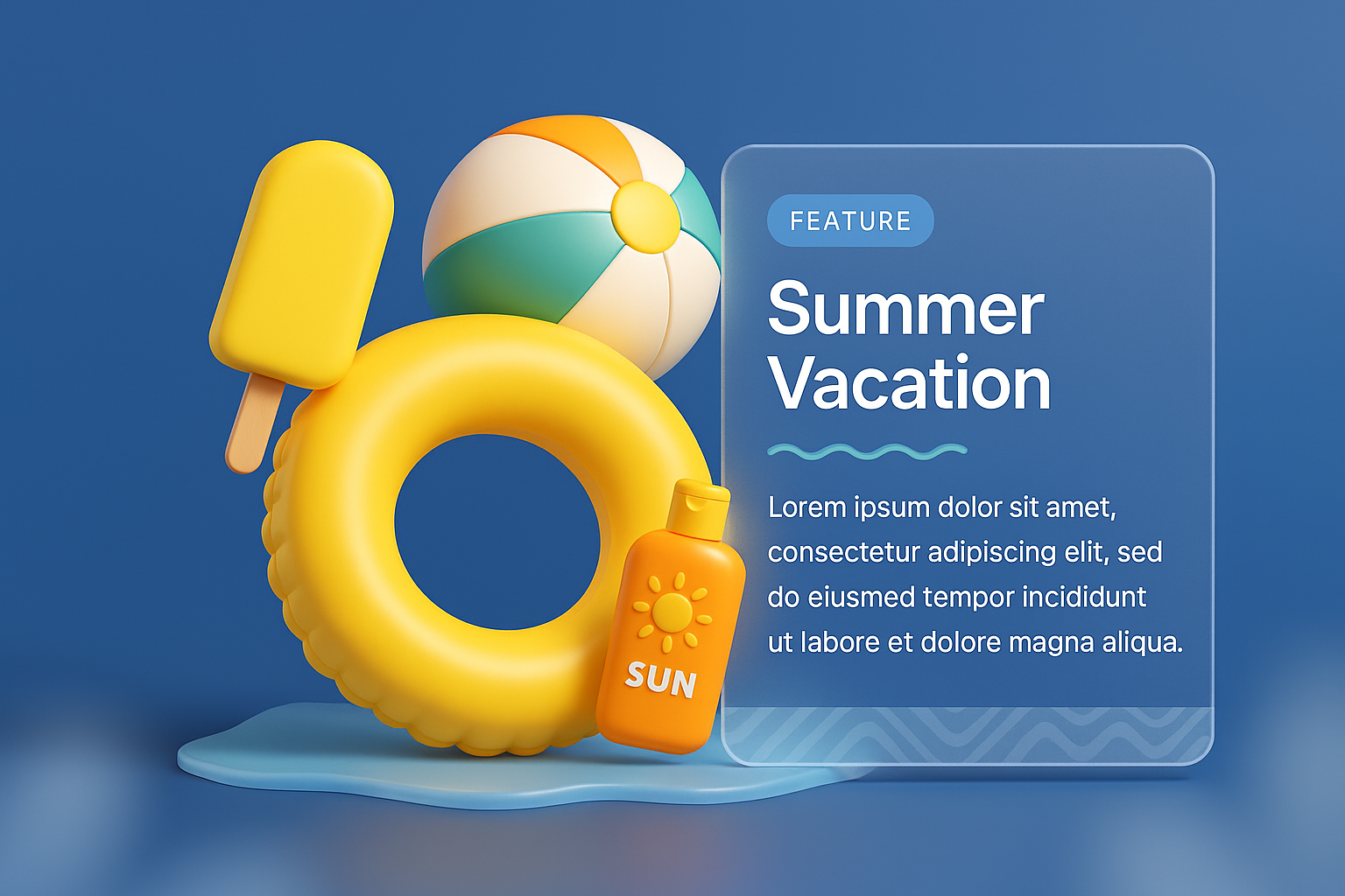/Collection: /by davooda/Type: PNG/A vibrant 3D illustration featuring a swim ring, ice cream, sun cream, and an inflatable ball, set against a smooth gradient background. The design exudes a fun and playful summer vibe.