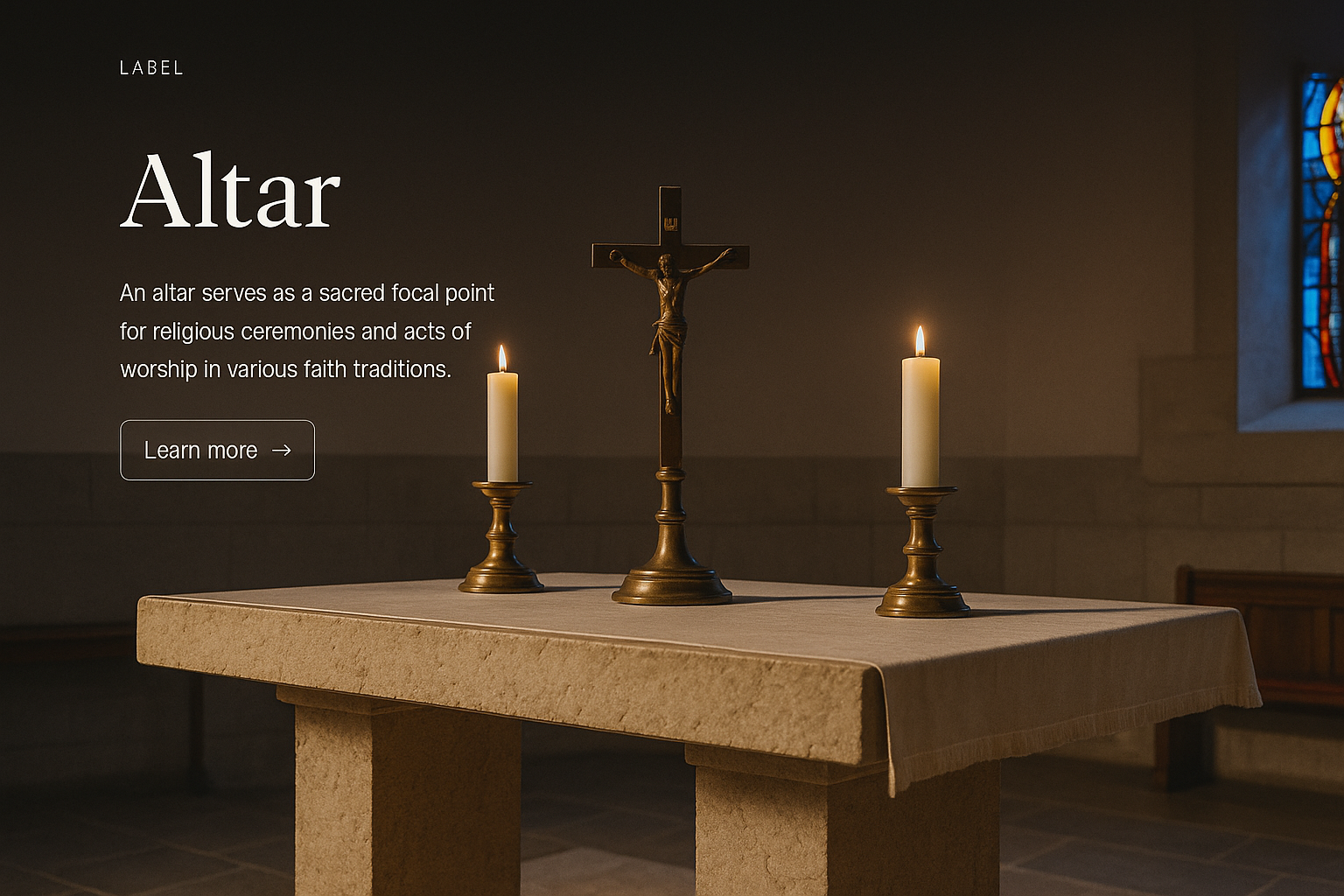 A visually appealing web design mockup featuring an altar with candles and a crucifix, ideal for religious contexts. The layout includes a label, title, descriptive text, and a call-to-action button.