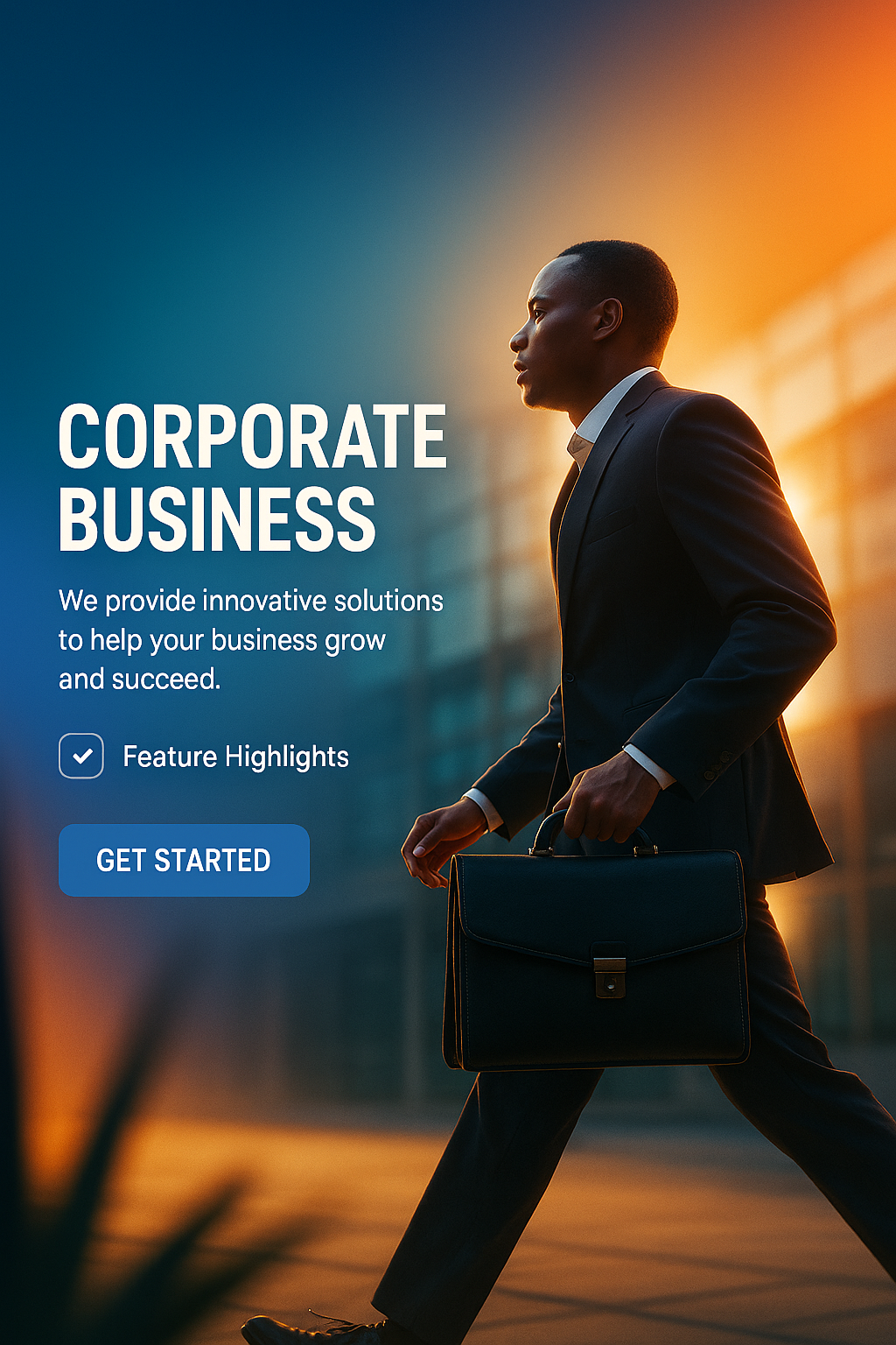 This banner features a professional man in a suit walking with a briefcase, symbolizing business growth. Itβs designed for marketing corporate services.