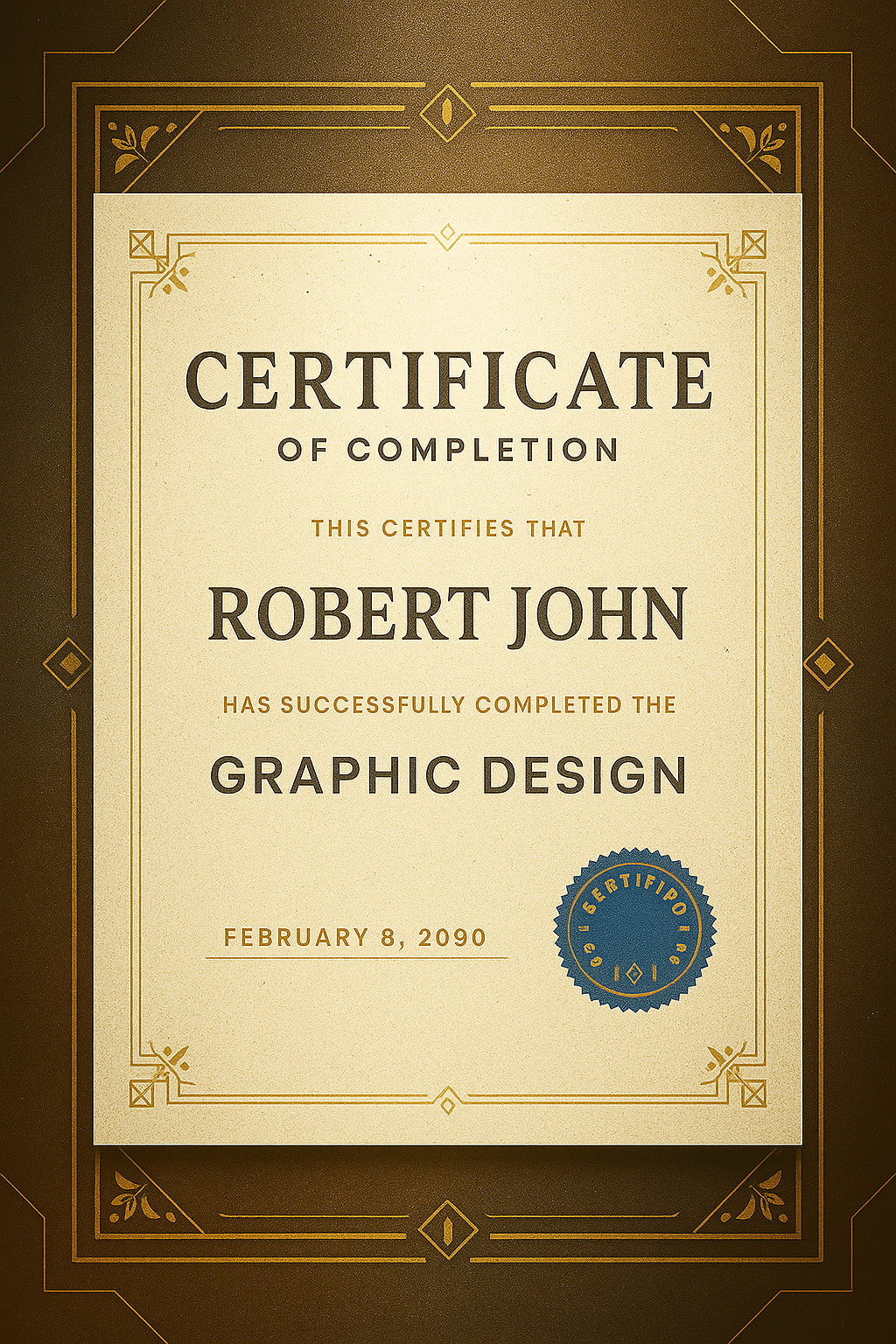 A beautifully crafted certificate of completion with ornate borders and a classic typeface, ideal for academic or professional achievements.
