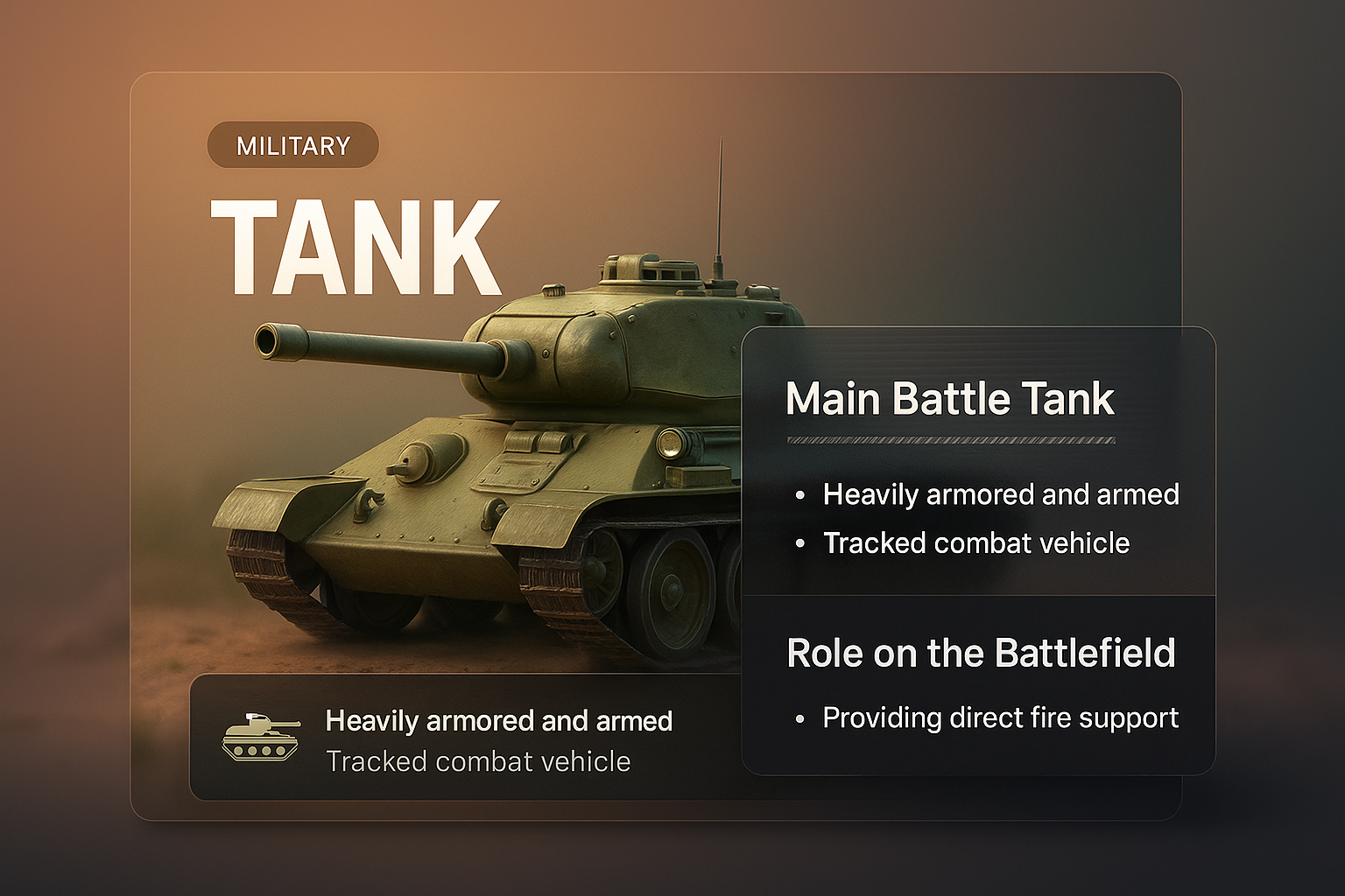 A detailed 3D illustration of a military tank featuring two integrated information blocks. The design includes a gradient background, enhancing visual depth and realism.