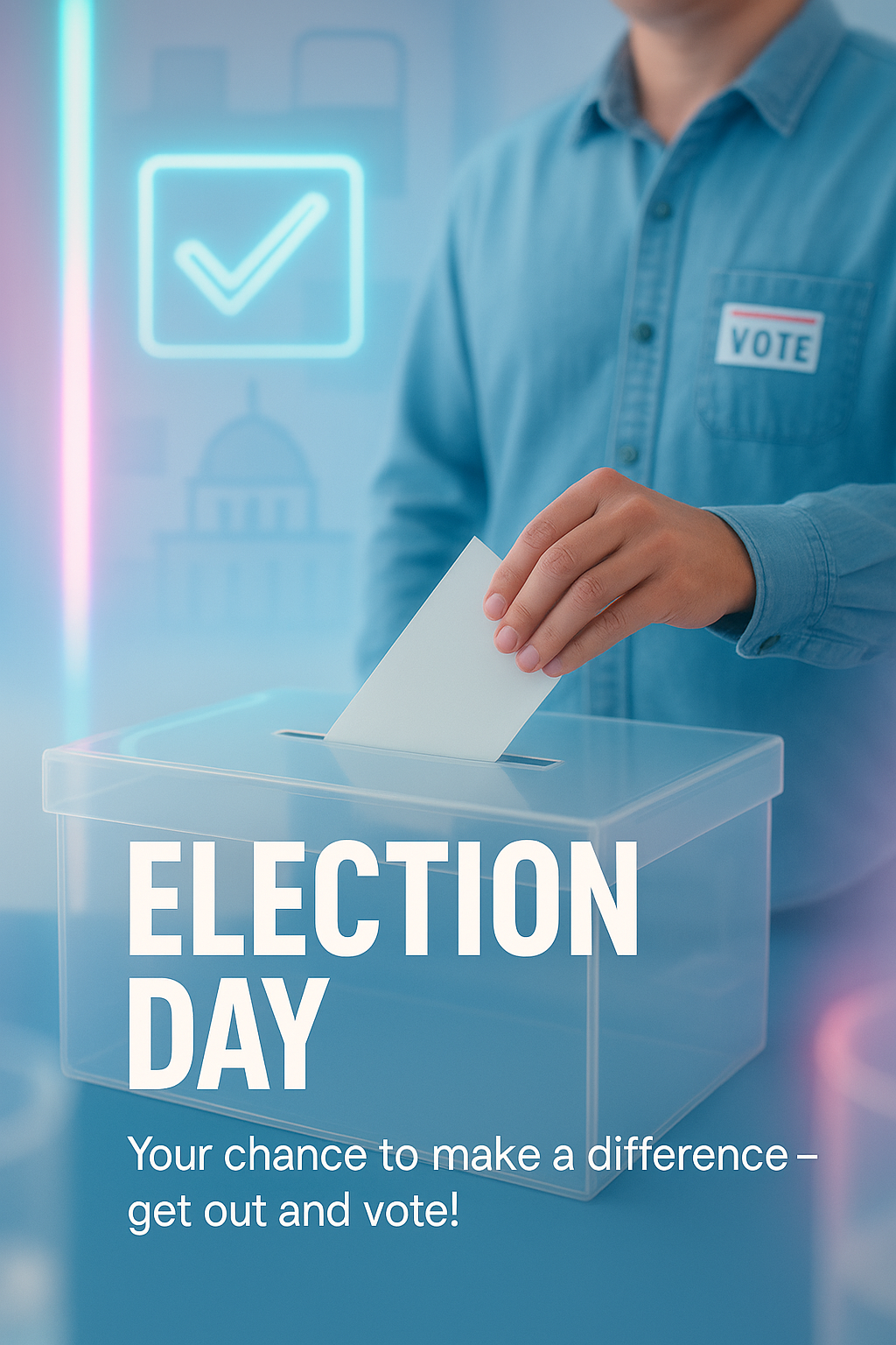 /Collection: /by davooda/Type: PNG/Engaging graphic designed to promote voter participation on Election Day. Featuring a person casting a ballot in a transparent box, this image utilizes modern design elements to inspire civic engagement.