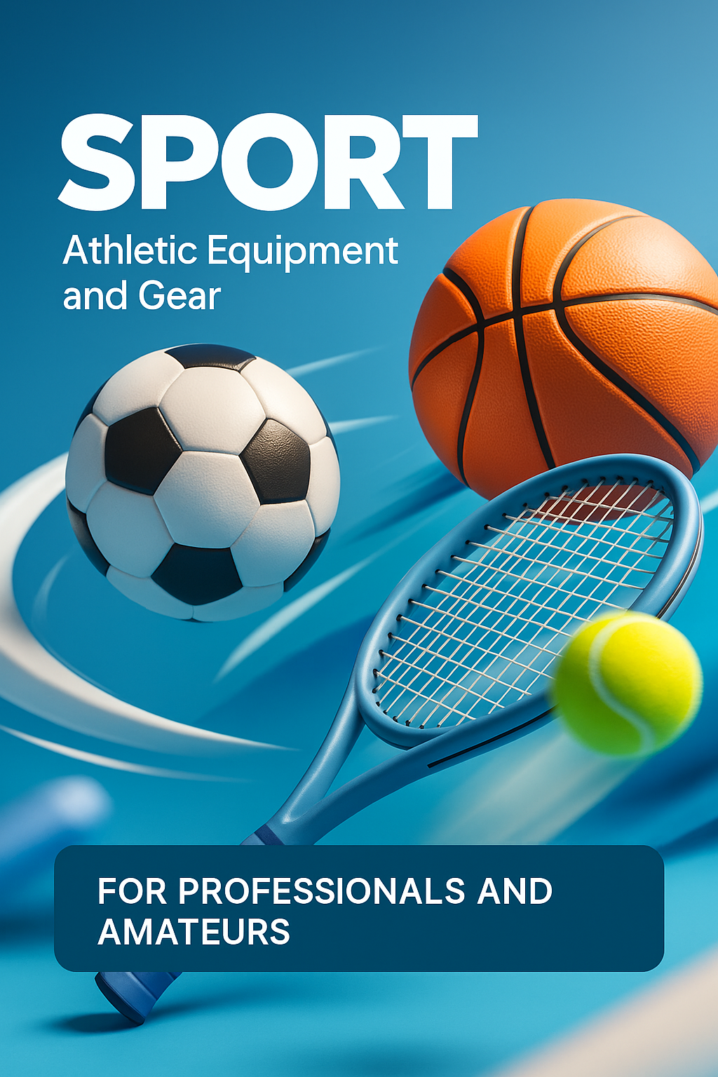 A vibrant 3D illustration featuring various sports equipment including a soccer ball, basketball, tennis racket, and tennis ball, set against a smooth gradient background.