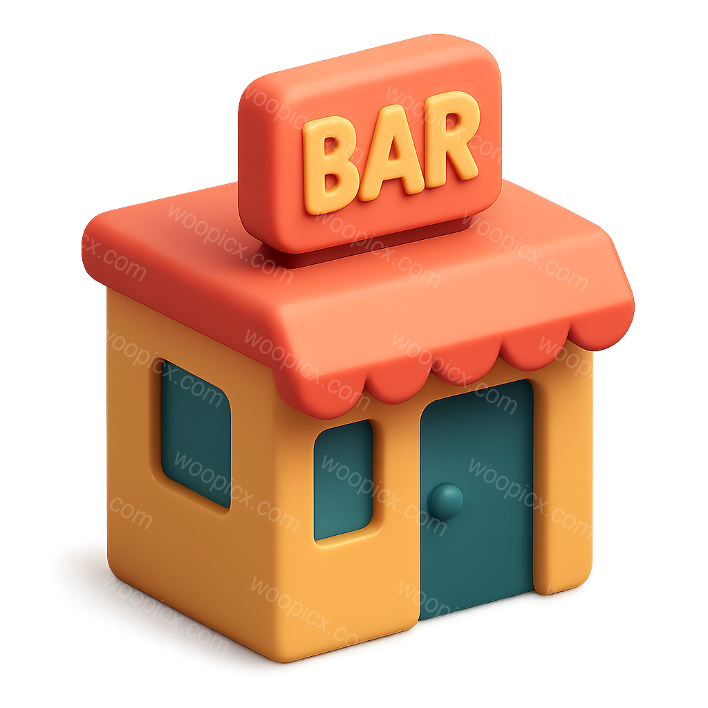A vibrant 3D icon of a bar, featuring a stylized shop design with a bright orange roof, yellow walls, and a blue door. The isometric view showcases its volumetric feel.