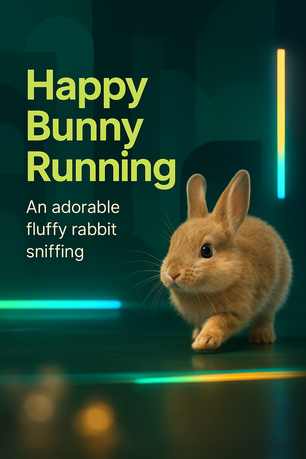 A delightful photo of a fluffy rabbit in motion, set against a vibrant background with colorful lighting. Ideal for animal lovers and pet-related content.