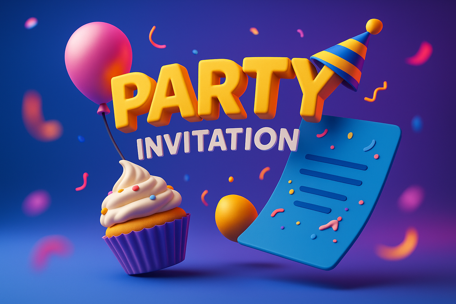 A lively 3D illustration featuring a party invitation with colorful elements like balloons, confetti, and a cupcake. The dynamic composition enhances the festive vibe.
