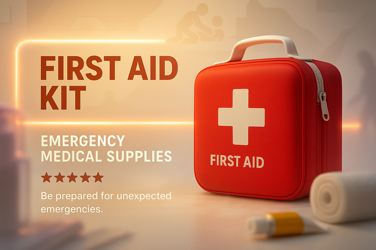 /Collection: /by davooda/Type: PNG/A visually striking 3D rendering of a red first aid kit featuring emergency medical supplies, designed for promotional or informational purposes in health and safety contexts.