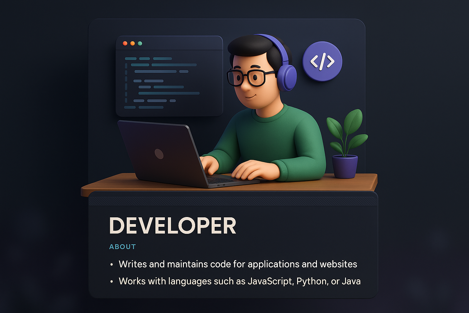 /Collection: /by davooda/Type: PNG/A 3D illustration of a developer working on a laptop, featuring coding elements and a stylish dark background. The design integrates text blocks and subtle visual layers for depth.