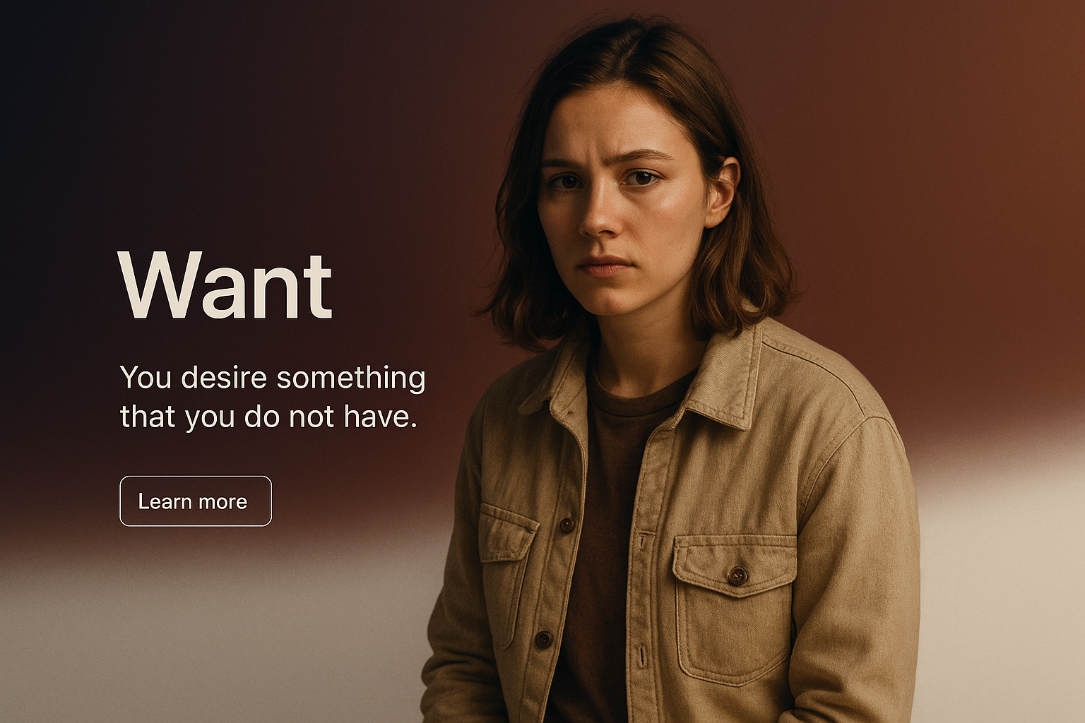 /Collection: /by davooda/Type: PNG/A visually striking web design showcasing a young woman with a contemplative expression. The background features a two-color gradient transitioning from dark to white. The design includes a prominent 'Want' header and a 'Learn more' action button.