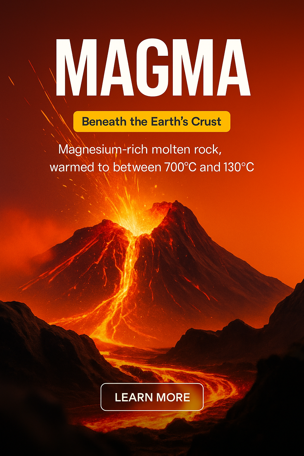 This image depicts a vibrant magma flow erupting from a volcanic mountain under a dramatic sky. The scene emphasizes the heat and energy of molten rock with bold text overlay.