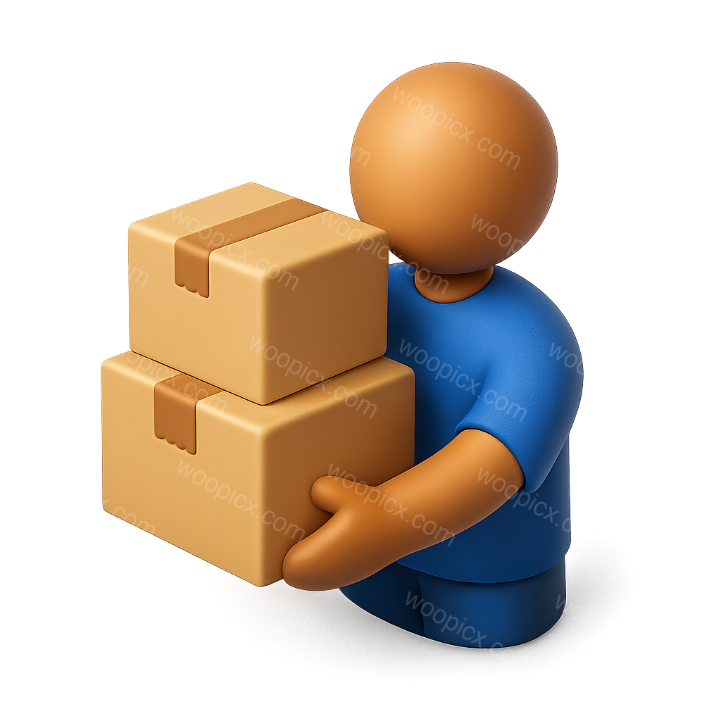 /Premium/Collection: /by davooda/Type: PNG/This image features a stylized 3D icon depicting a person with a round head and simplistic body, holding two stacked packages. The figure is designed with a blue shirt and a friendly appearance, set against a soft gradient background.