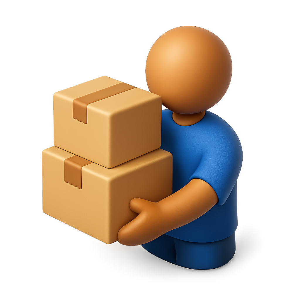 /Collection: /by davooda/Type: PNG/This image features a stylized 3D icon depicting a person with a round head and simplistic body, holding two stacked packages. The figure is designed with a blue shirt and a friendly appearance, set against a soft gradient background.