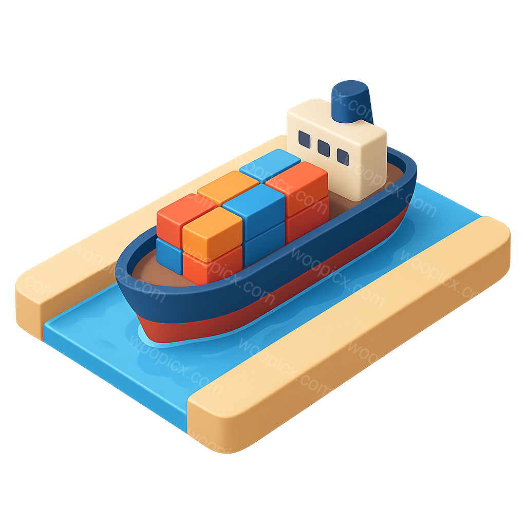/Premium/Collection: /by davooda/Type: PNG/A visually striking 3D icon illustrating a cargo ship navigating through a Suez Canal passage. The design features a colorful arrangement of cargo boxes on the ship, set against a stylized waterway.