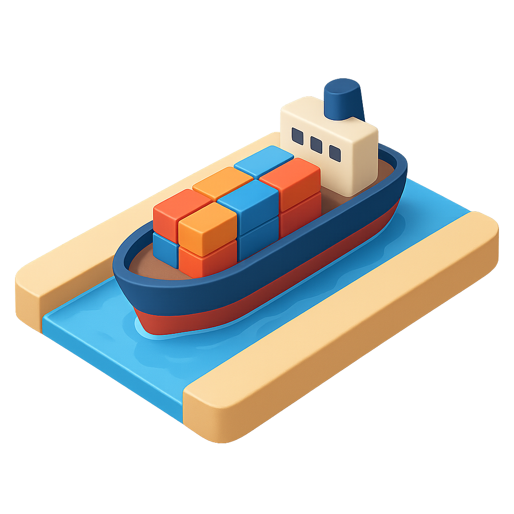 /Collection: /by davooda/Type: PNG/A visually striking 3D icon illustrating a cargo ship navigating through a Suez Canal passage. The design features a colorful arrangement of cargo boxes on the ship, set against a stylized waterway.