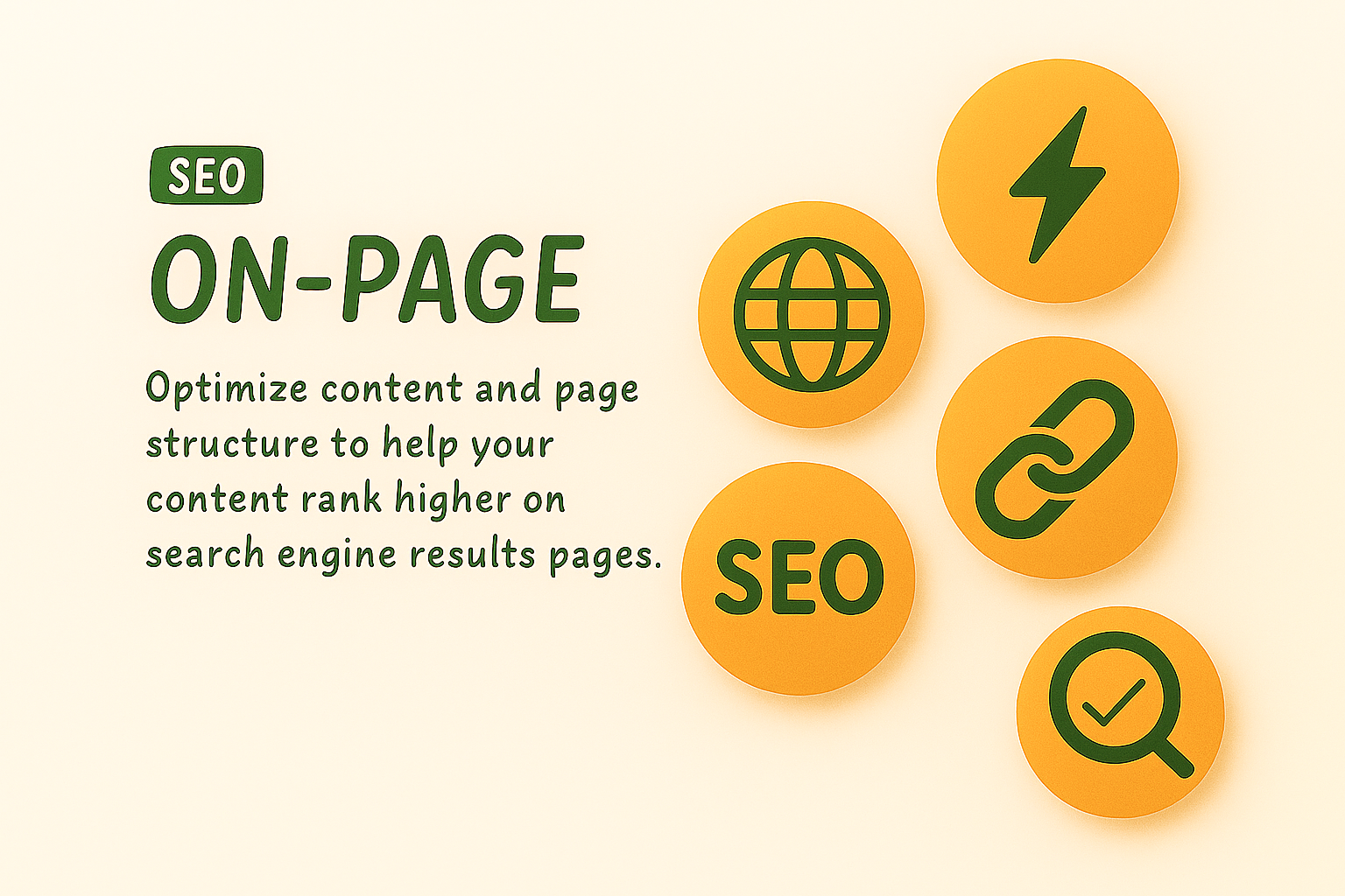 Informative graphic illustrating on-page SEO concepts with vibrant icons and engaging text, suitable for digital marketing content.