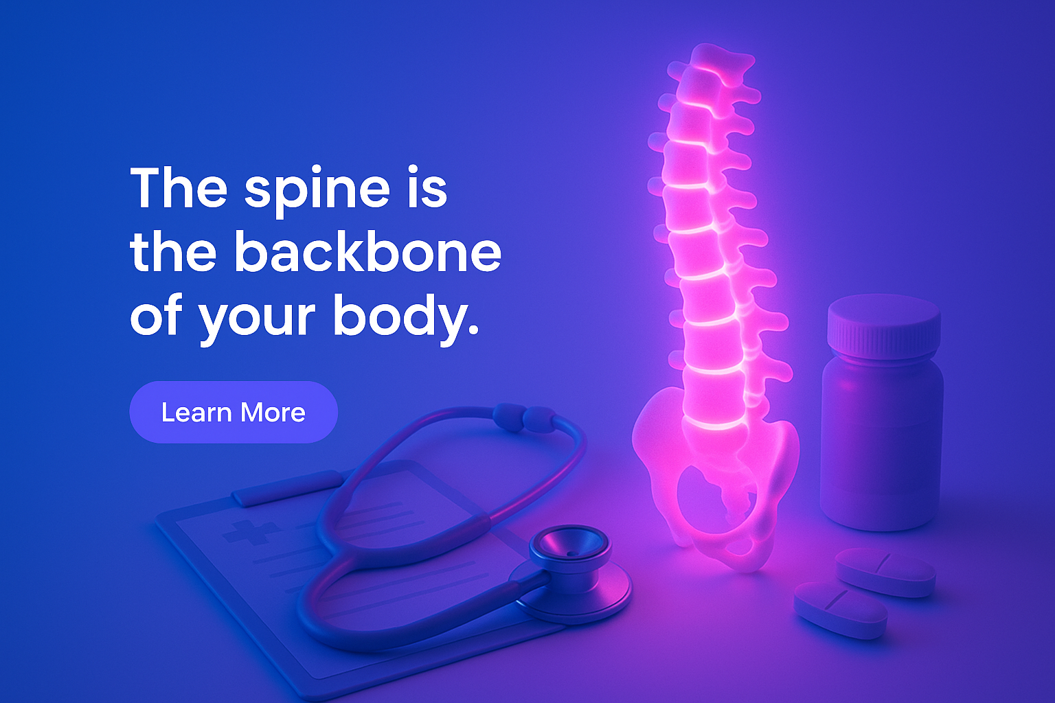 A visually striking composition featuring a glowing spine, emitting a neon-pink light. Surrounding elements include a stethoscope, medication, and a medical chart, all set against a solid blue background.