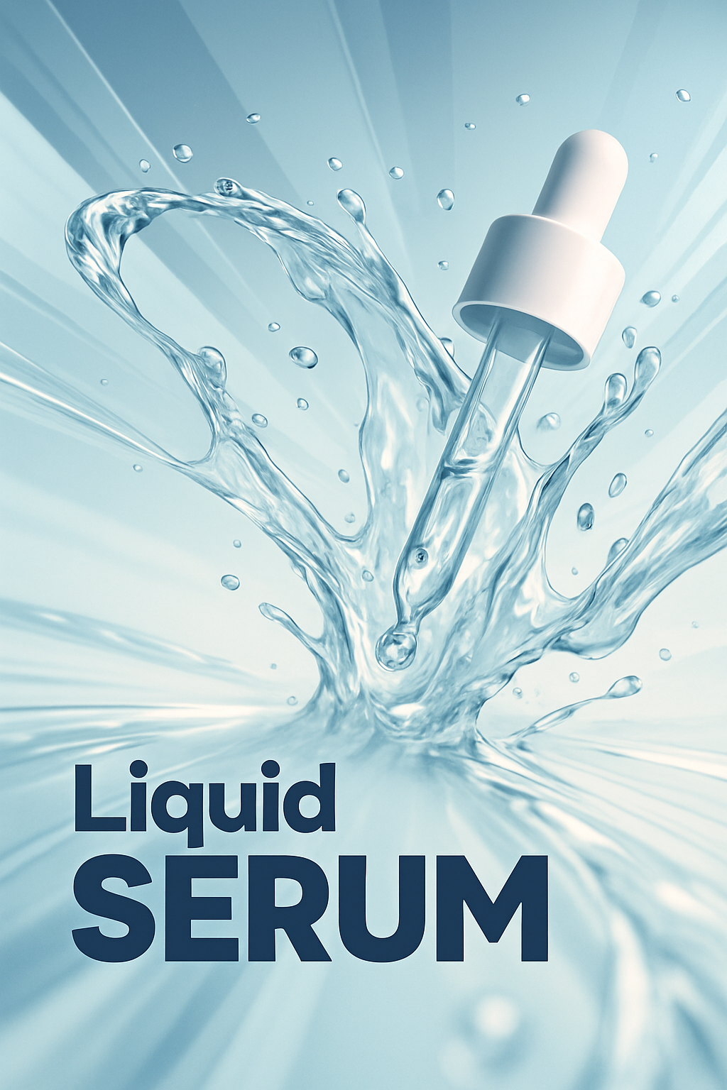 /Collection: /by davooda/Type: PNG/A vibrant splash of liquid serum or hyaluronic acid captured dynamically against a light pastel background. The design features a pipette amidst the watery explosion, creating a fresh and engaging look.