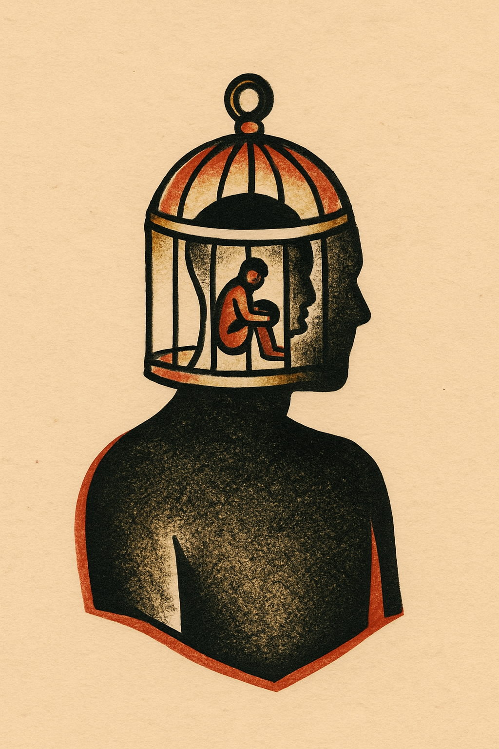 A silhouette of a head shaped like a cage, with a small figure sitting inside. The design features a blend of colors on a light beige background, resembling a classic tattoo style.